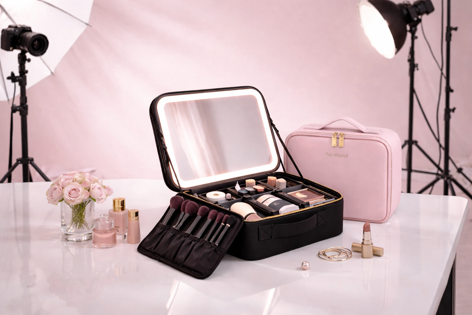 Miroir LED professionnel et organisation parfaite. Emportez votre routine beauté partout avec style et facilité absolue.